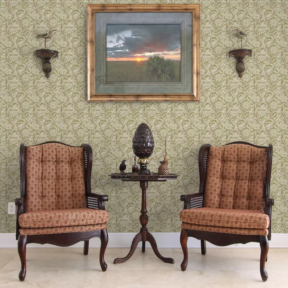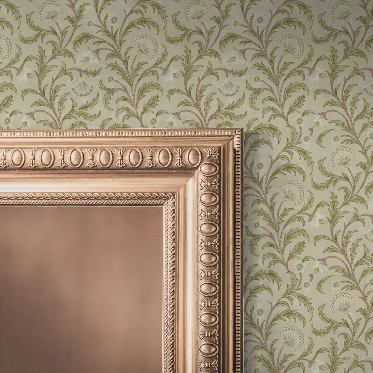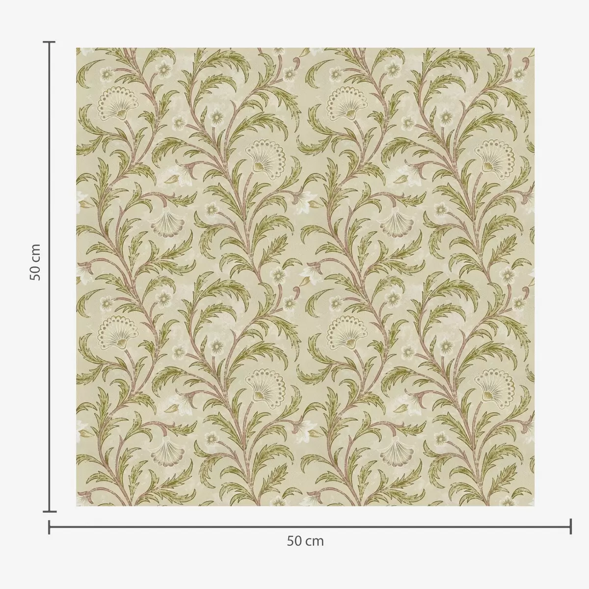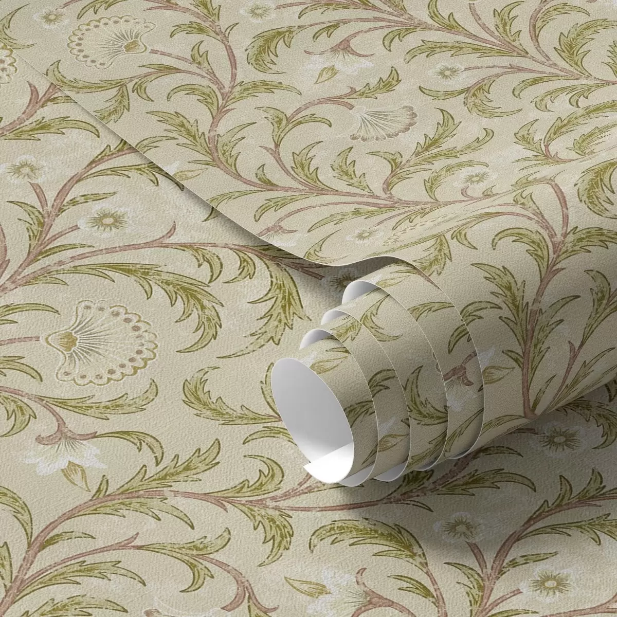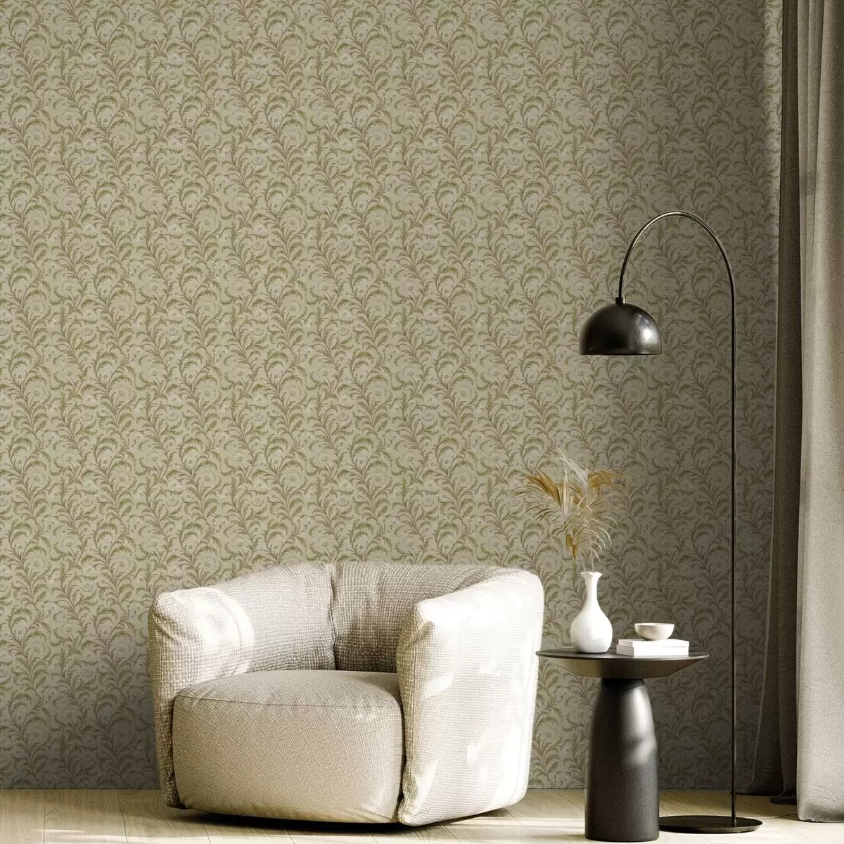 Wallpapers Vintage ornament with scrolls and flowers, beige and olive Nr. a00574