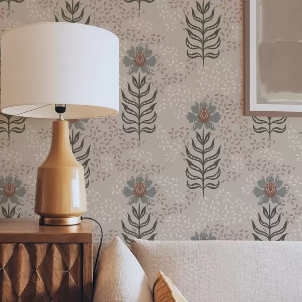 Wallpaper Stylized flowers and seeds on warm beige a00604
