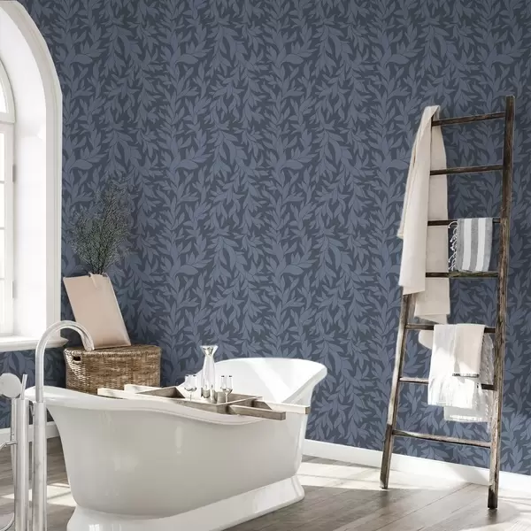 Wallpaper Graphite-blue background and blue leaves, textured stroke a00616v2