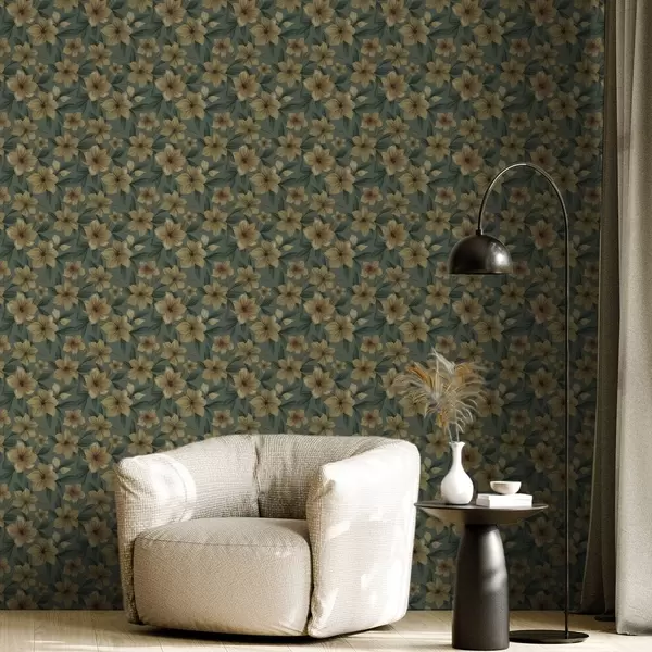 Wallpapers Ochre flowers on a deep green background, dense pattern Nr. a00628