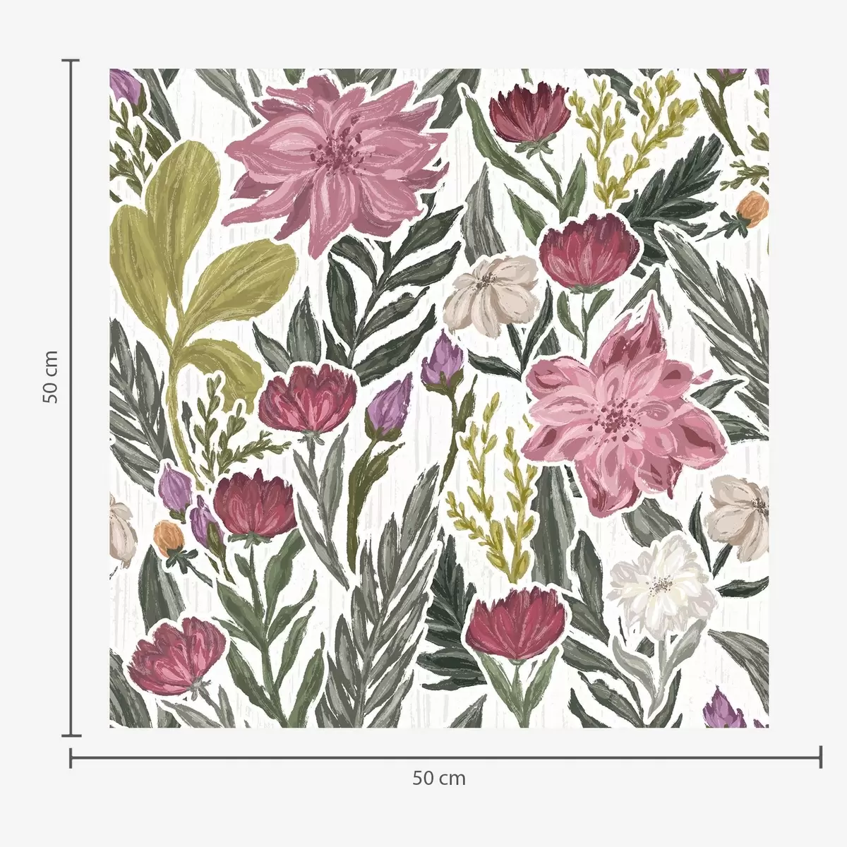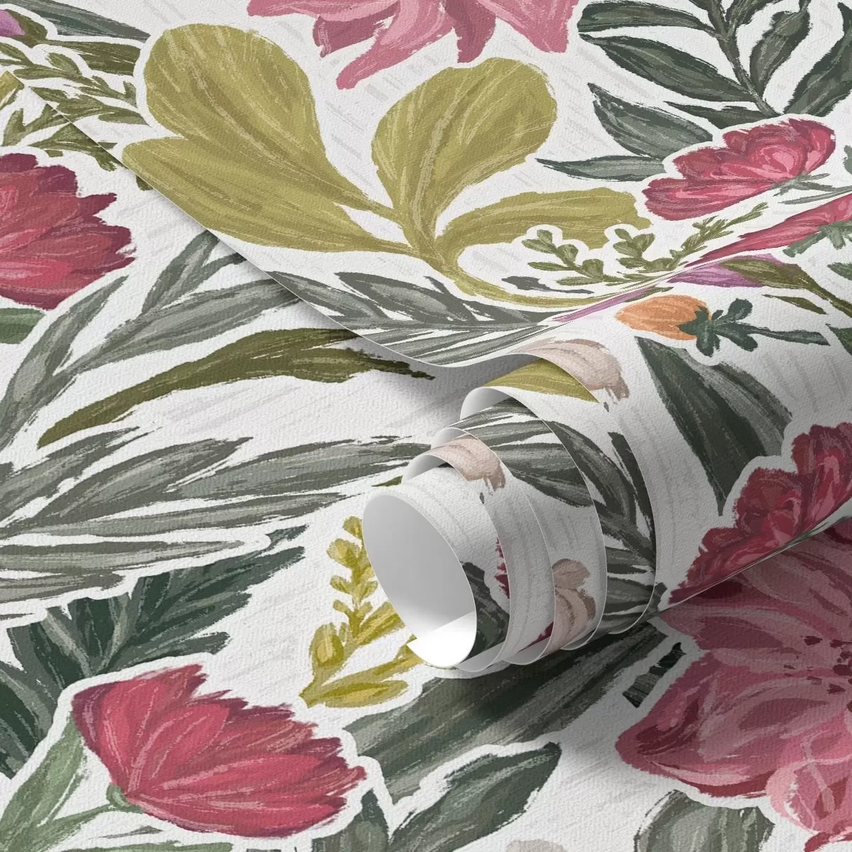 Wallpaper Lush pink and cream flowers on a white background, impasto texture a00629v1