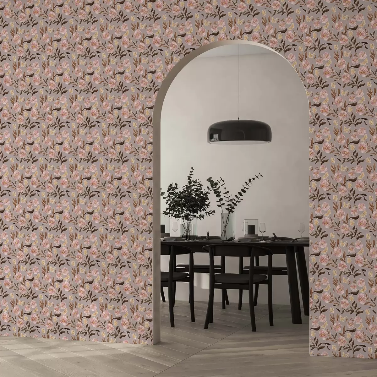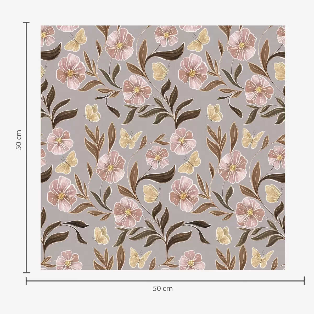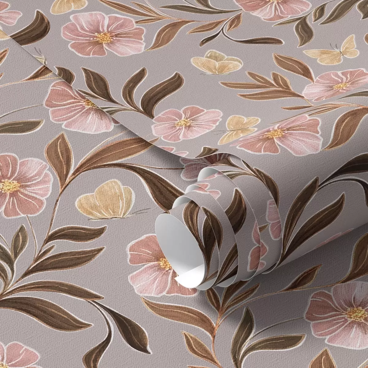 Wallpapers Pink flowers and butterflies on a gray-beige background Nr. a00633
