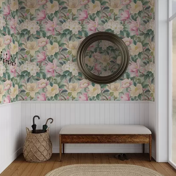 Wallpaper Magnolias and white blossoms on a mint-gray background a00644