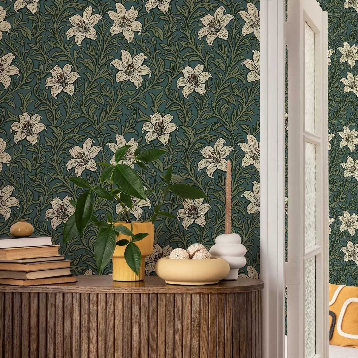 Wallpapers Cream lilies among dense greenery on a turquoise background Nr. a00645
