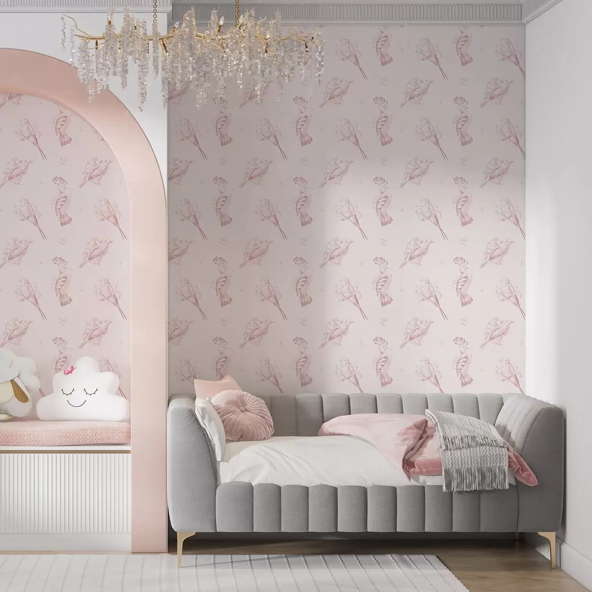 Wallpapers Bird toile: sketch birds, soft pink background Nr. a00656