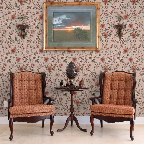 Wallpaper Pink-coral flowers and foliage on dusty pink a00667