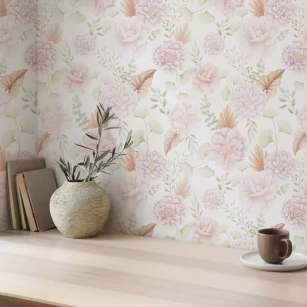 Wallpaper Soft pastel peonies and foliage on a white background a00669
