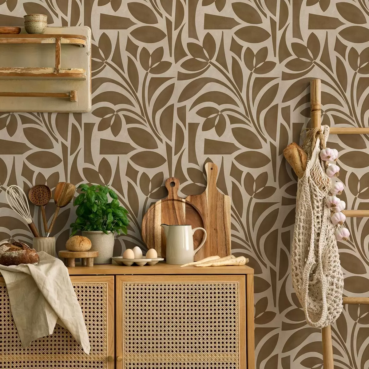 Wallpapers Geometric leaf silhouettes, caramel-brown on beige Nr. a00679