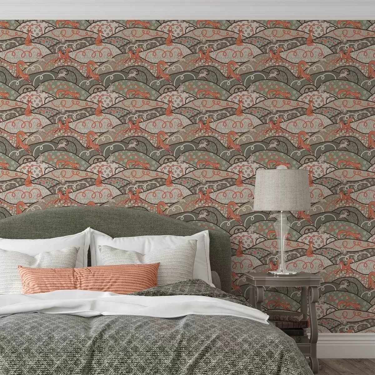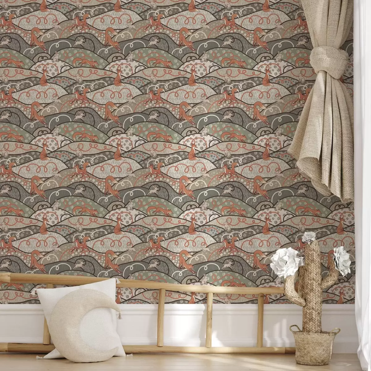 Wallpaper Foxes and hares on wavy hills, retro pattern a00690