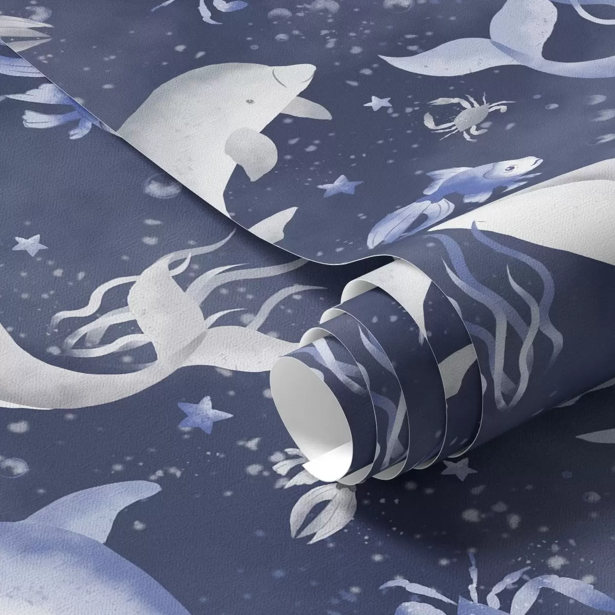 Wallpaper Sea whales, dolphins and crabs on a dark blue background a00720