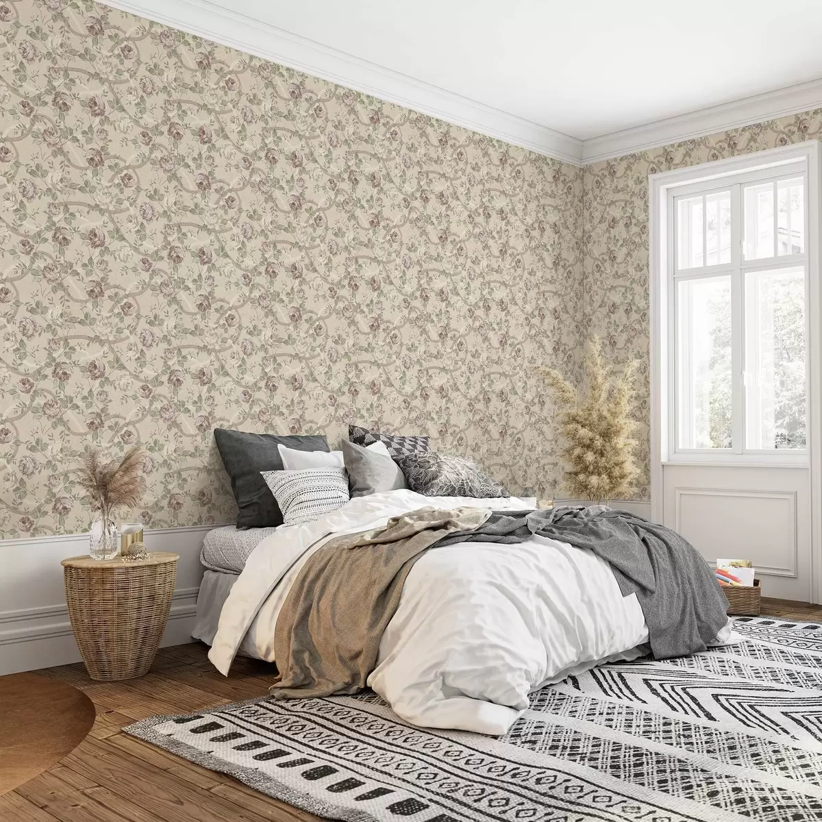 Wallpaper Roses with green leaves on a warm beige base a00729