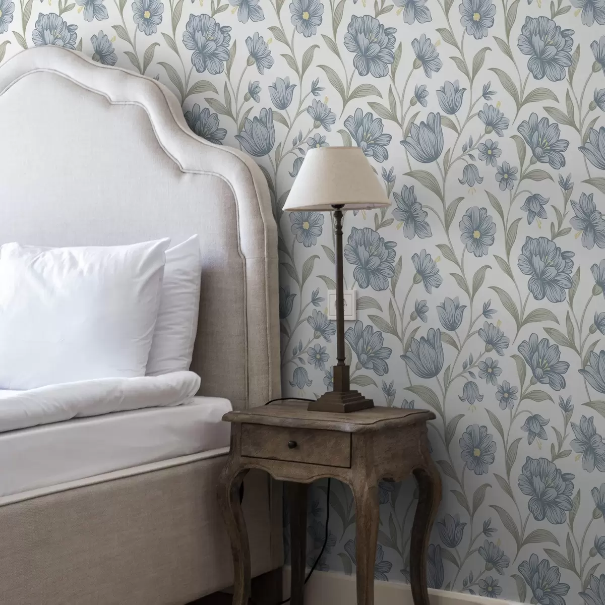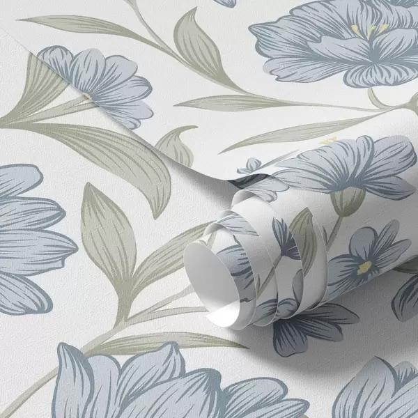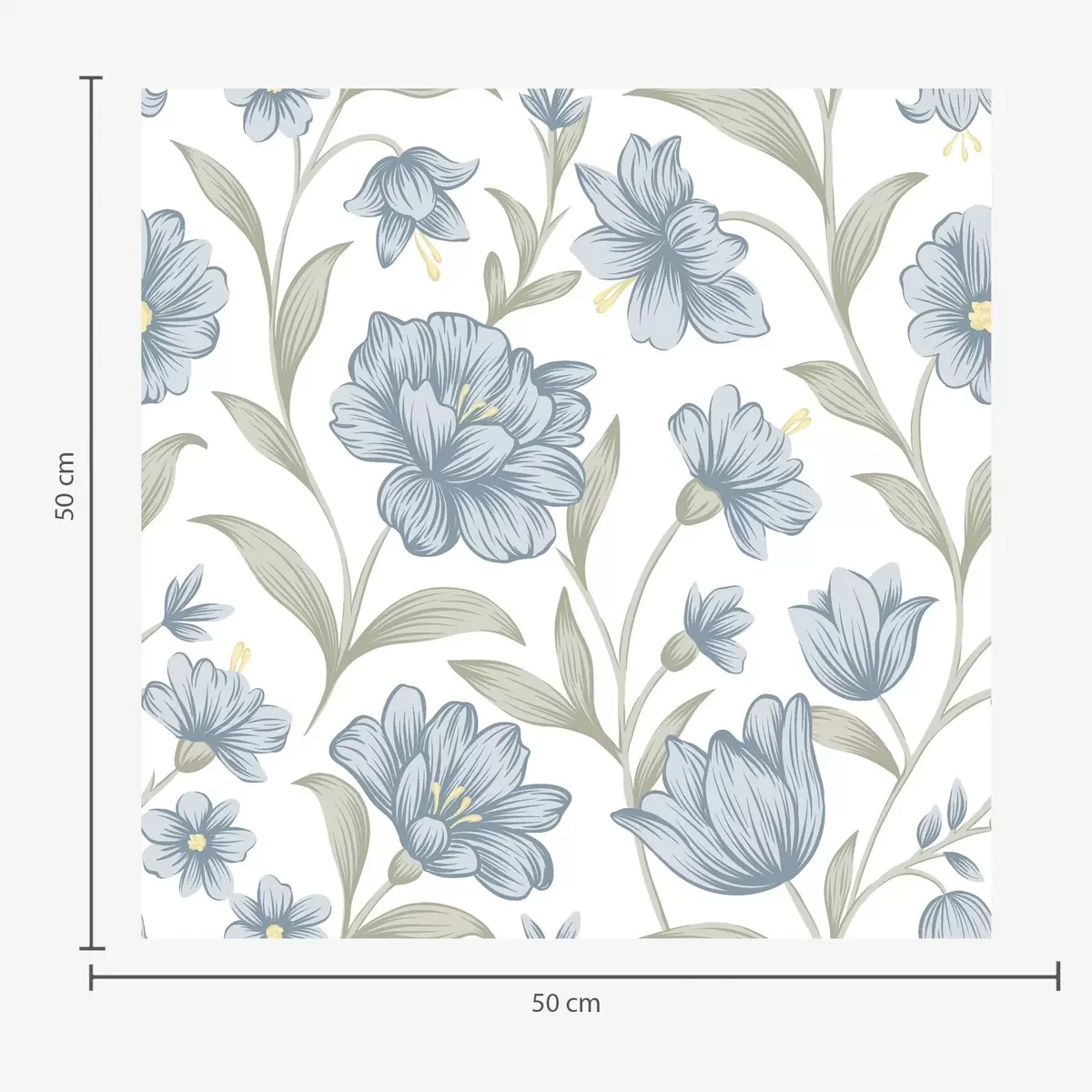 Wallpapers Dusty blue flowers with olive leaves on white Nr. a00780