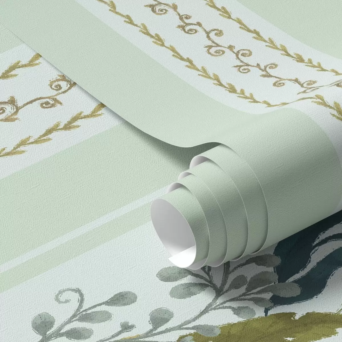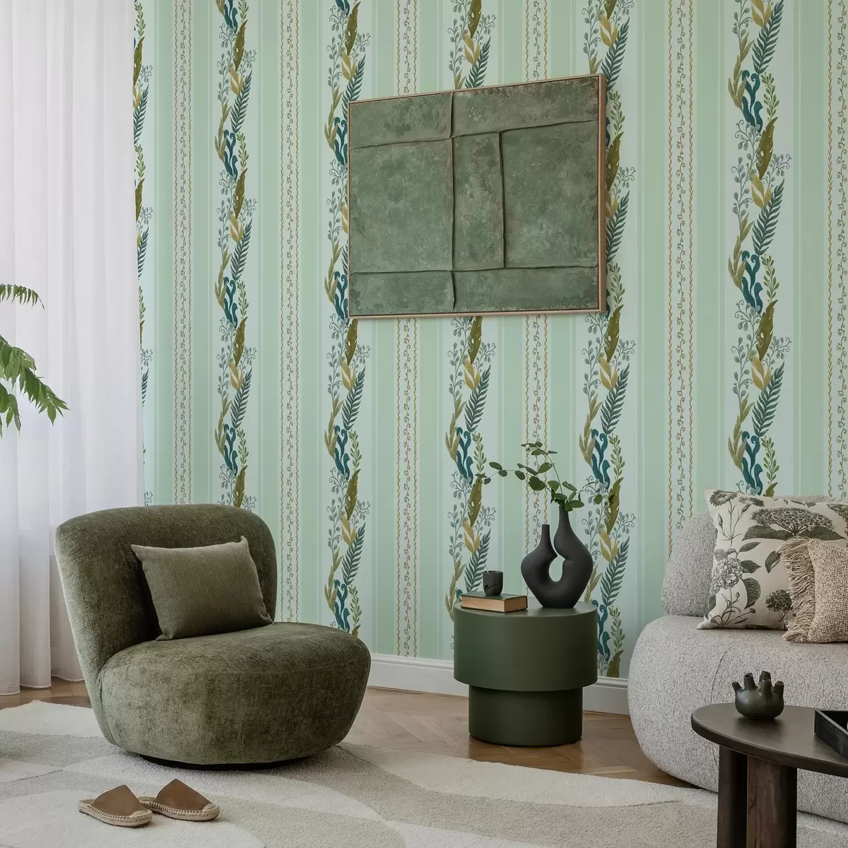 Wallpapers Wide stripes with painterly branches on soft mint Nr. a00825v1
