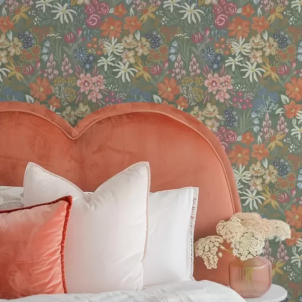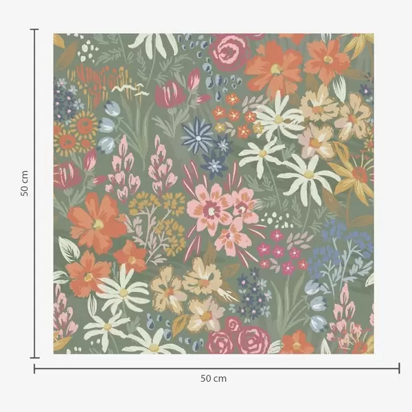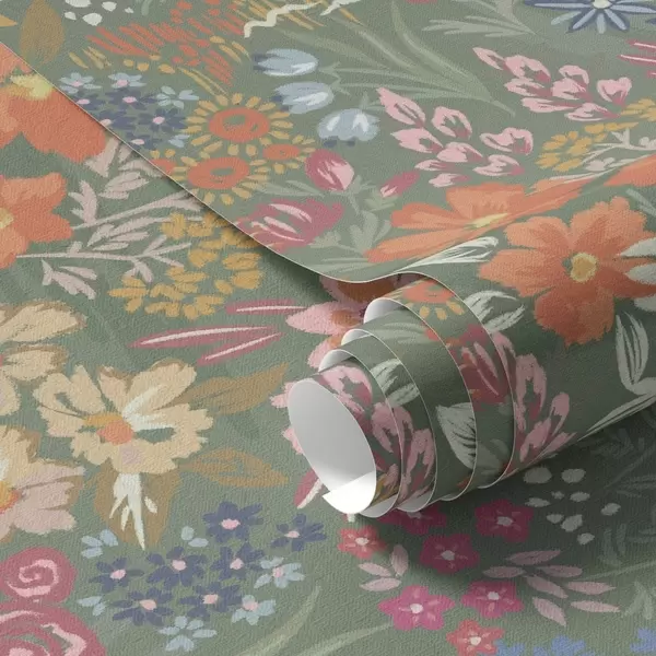 Wallpapers Painterly meadow florals on sage green Nr. a00864