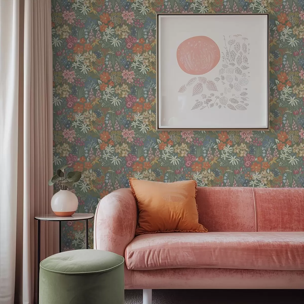 Wallpapers Painterly meadow florals on sage green Nr. a00864