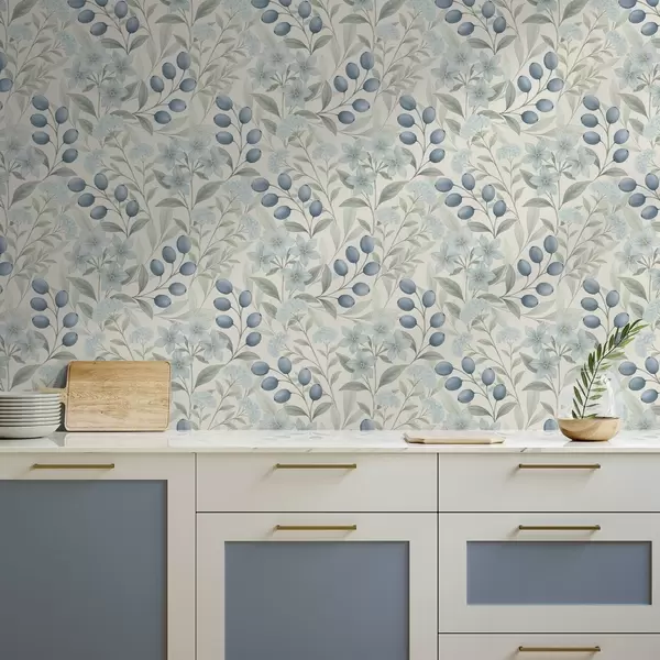 Wallpapers Blue berries and light flowers on ivory Nr. a00872
