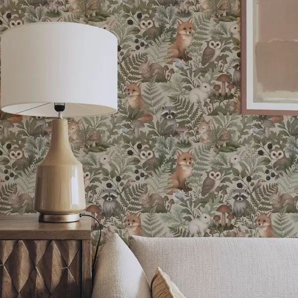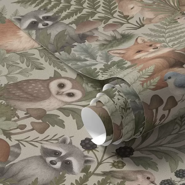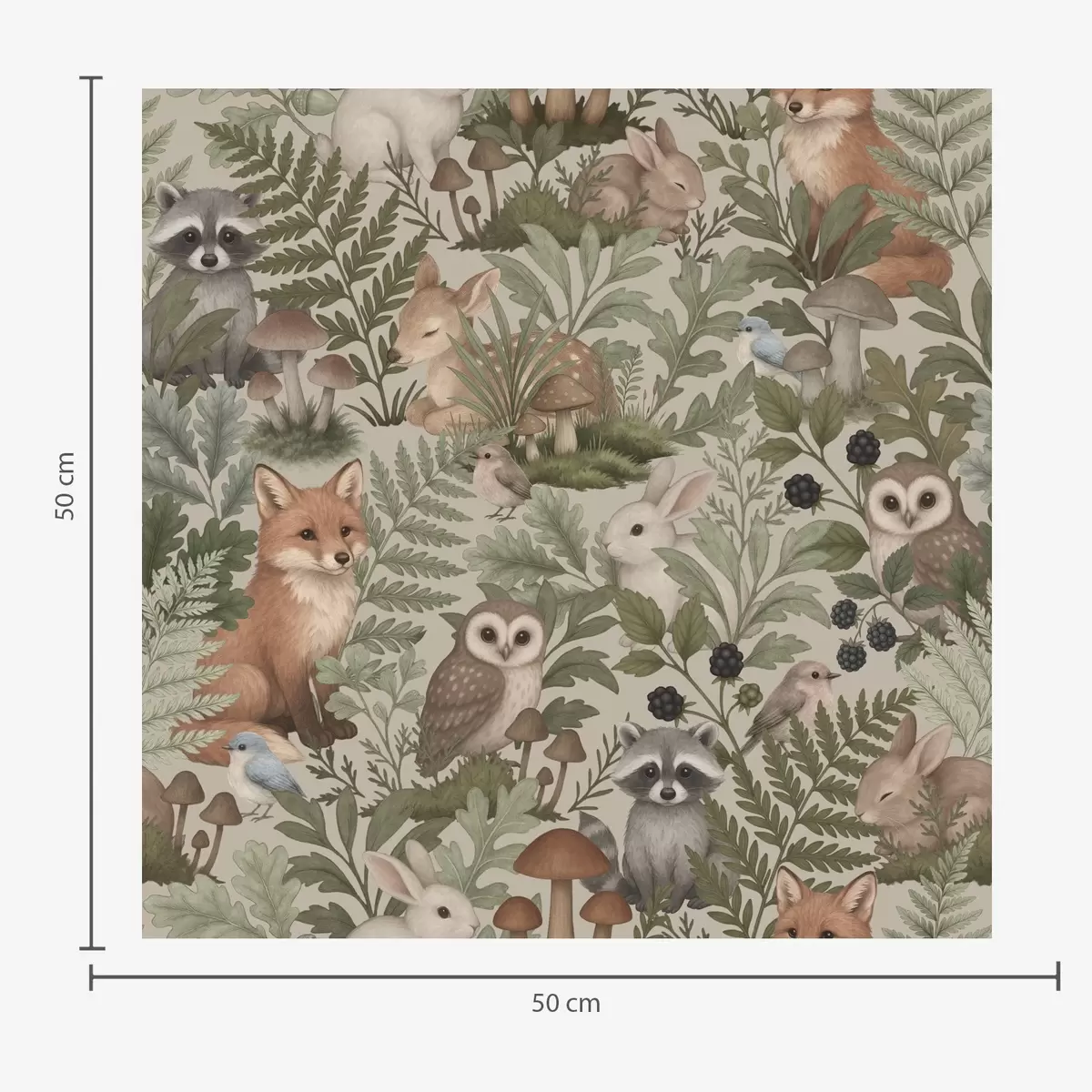 Wallpapers Woodland animals, ferns and mushrooms on light beige Nr. a00880v1