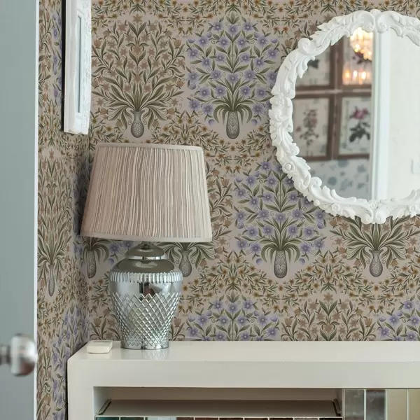 Wallpapers Alternating vases and blue florals in sage on blush Nr. a00901