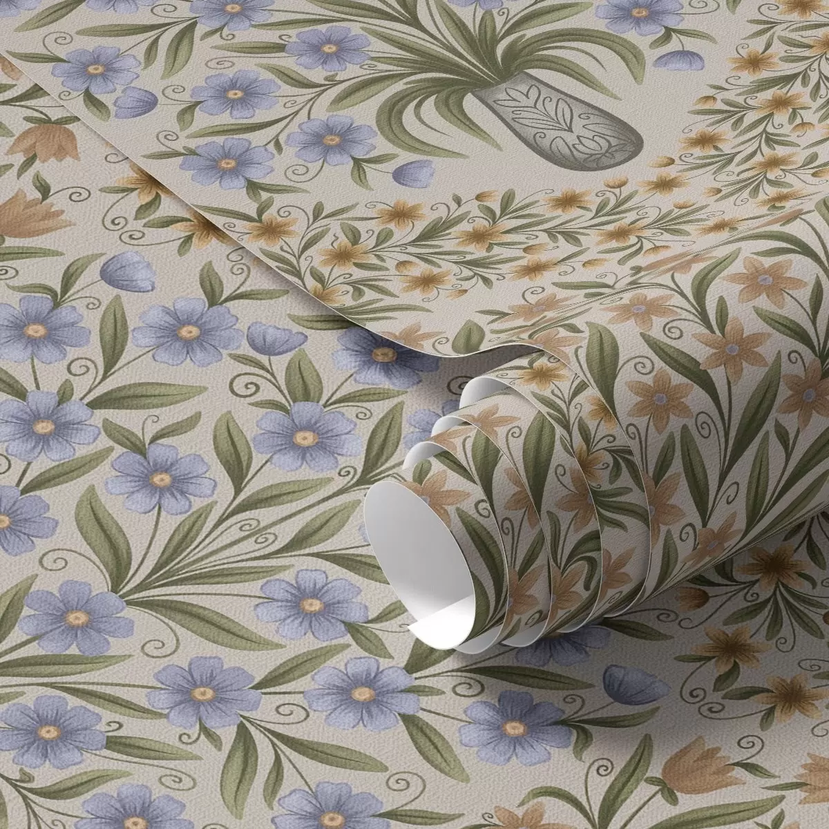 Wallpaper Alternating vases and blue florals in sage on blush a00901