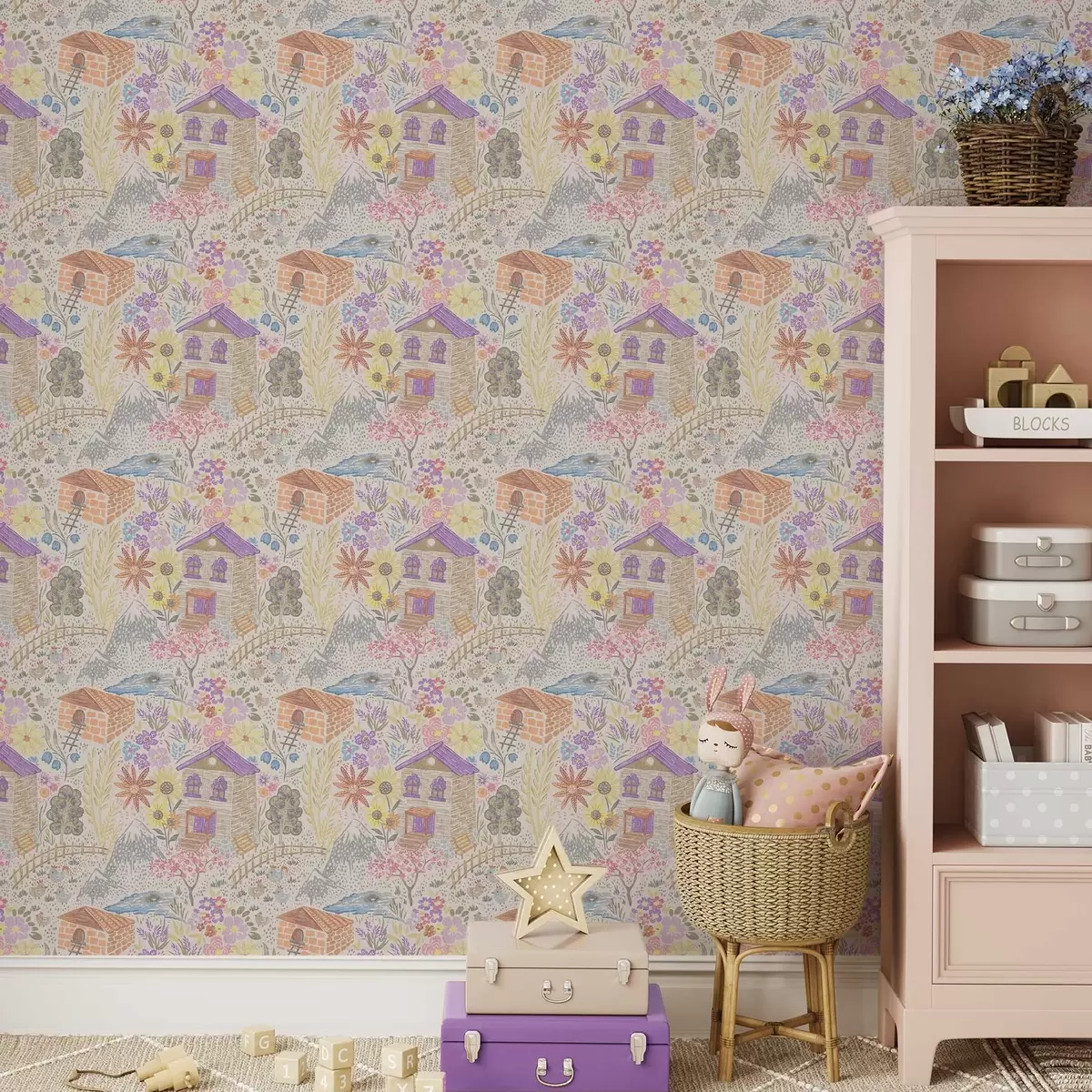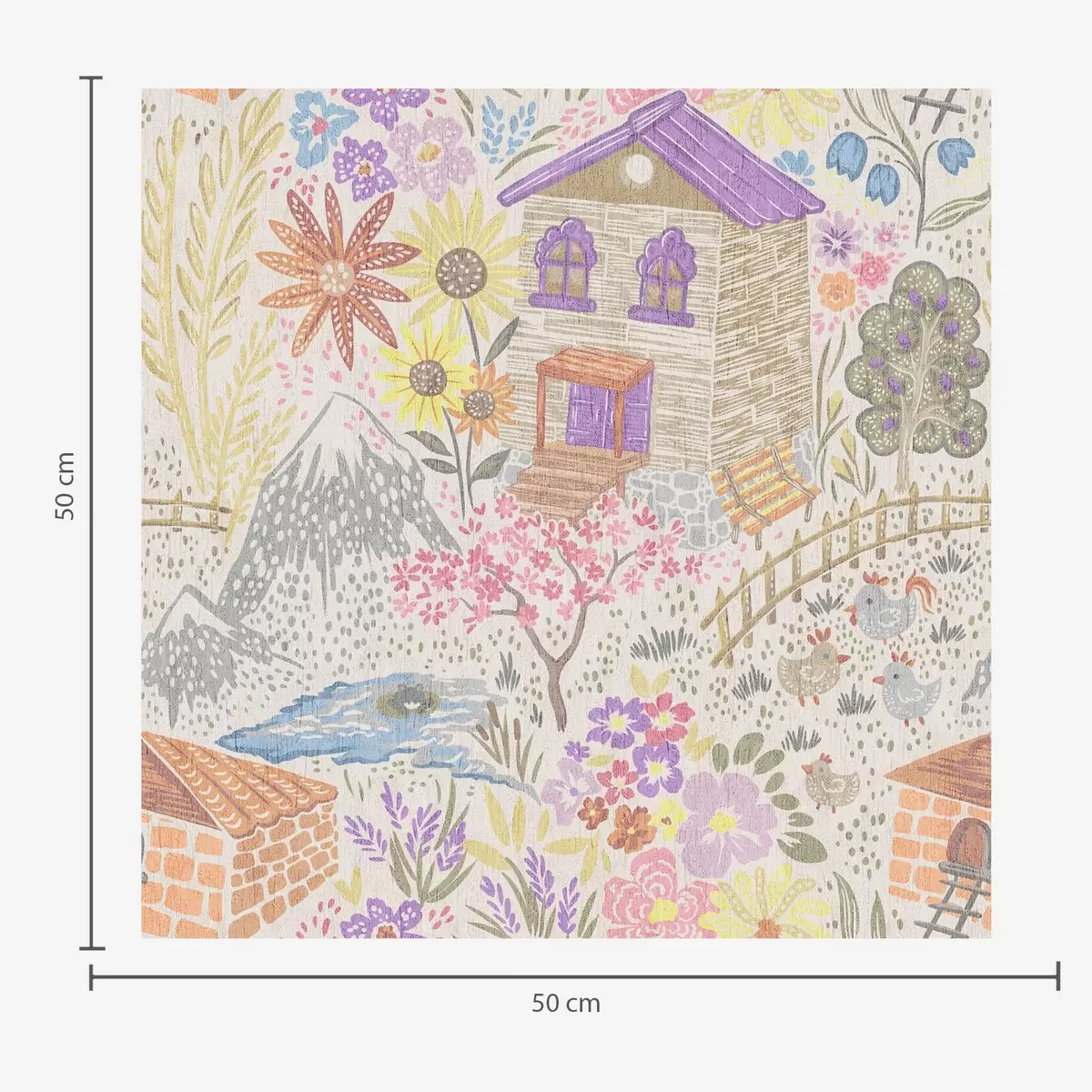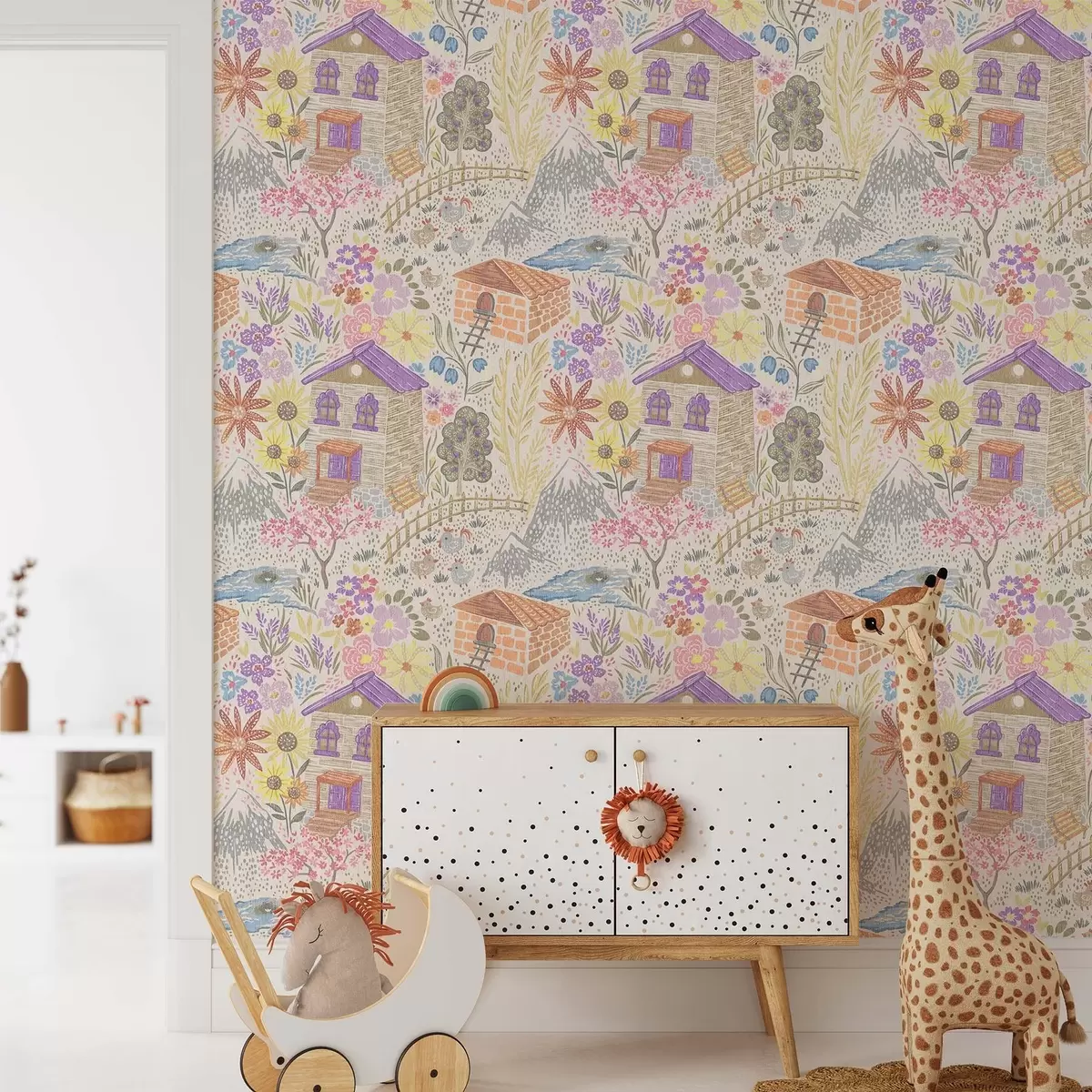 Wallpapers Childlike village drawing with a house, mountains and flowers Nr. a00952