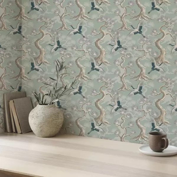 Wallpapers Cranes among curved branches on a soft sage-coloured background Nr. a01023