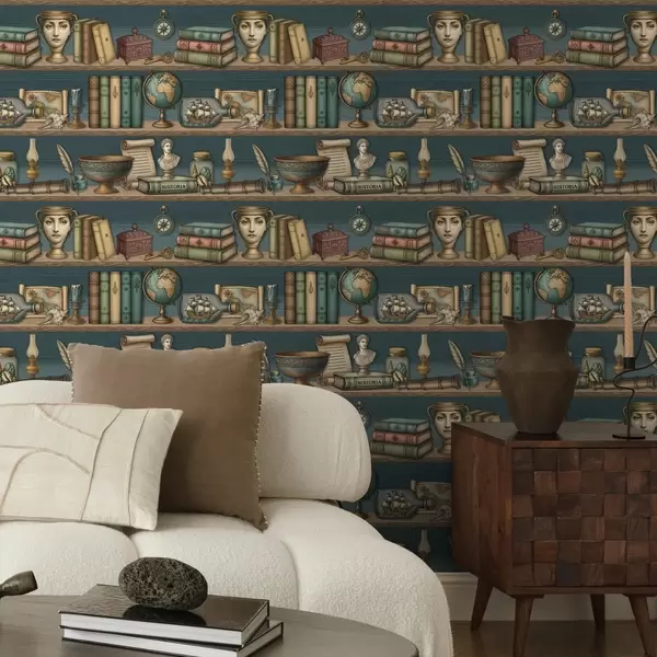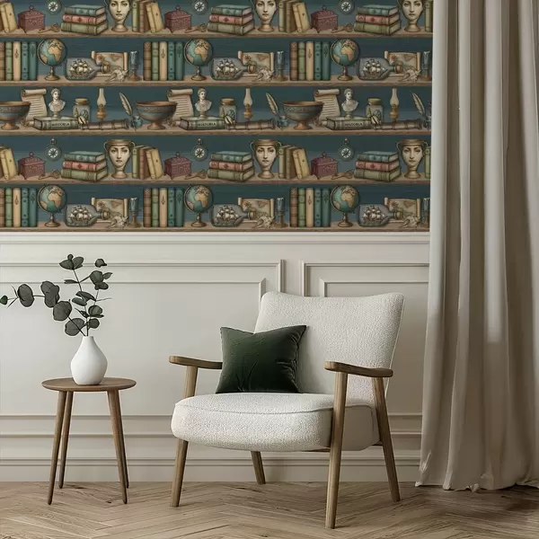 Wallpapers Vintage shelves with books, a globe and sea curiosities Nr. a01036